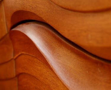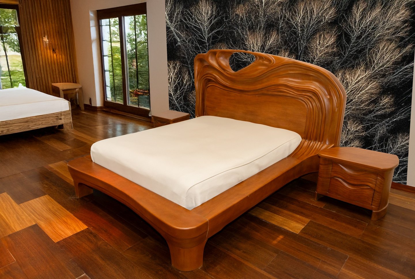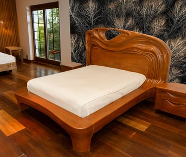 La alcoba "Organique Nouveau" es una obra maestra de diseño que fusiona la calidez de la madera fina de caoba con la elegancia del Art Nouveau. Sus curvas orgánicas, inspiradas en la naturaleza y en la obra de Gaudí, crean un refugio de serenidad y belleza. El detalle esculpido en la cabecera añade un toque íntimo y secreto, mientras que la pintura de poliuretano color miel resalta la calidez y el brillo de la madera. Cada elemento de esta alcoba ha sido cuidadosamente elaborado para crear un espacio que no solo es funcional, sino también una expresión de arte y buen gusto.